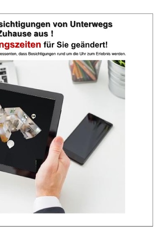 Besichtigungen von Unterwegs oder von Zuhause aus ! Showroom genannt, ermöglicht es Ihren Interessenten, dass Besichtigungen rund um die Uhr zum Erlebnis werden.